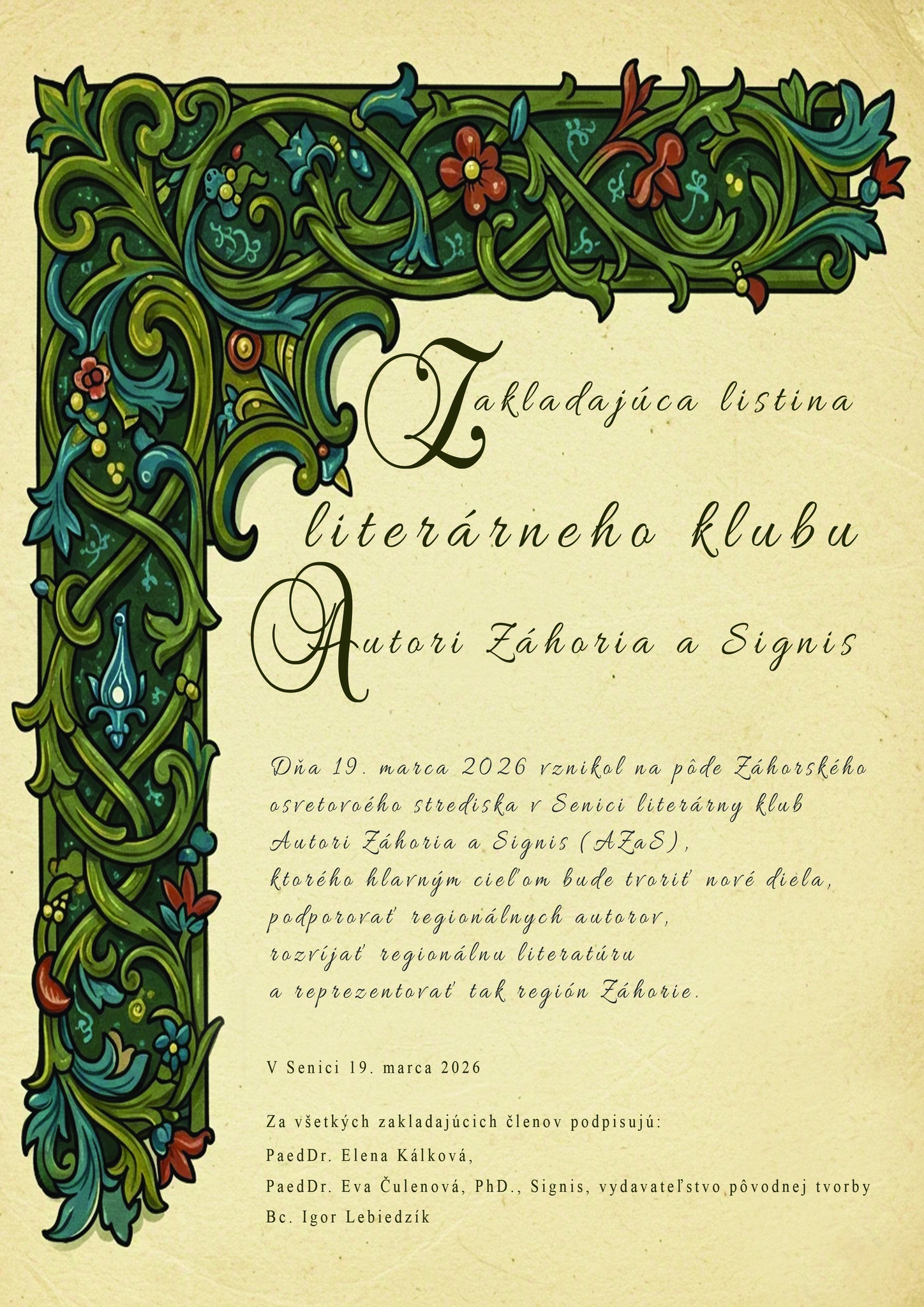 Vo štvrtok 19. marca 2026 sa v Záhorskom osvetovom stredisku (ZOS) v Senici uskutočnila pekná veľká akcia: vznikol nový literárny klub Autori Záhoria a Signis (AZaS), ktorého myšlienkovou „matkou“ a spoluorganizátorkou (spolu so ZOS) bola senická spisovateľka Elena Kálková, a zároveň sa tu prezentovali autori publikujúci v našom vydavateľstve. Tí sa stali aj zakladajúcimi členmi klubu, obdržali aj zakladajúcu listinu nového klubu.
